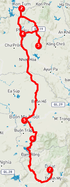 Early cycling from your hotel to home to the J’rai hill-tribe on a fertile basaltic plateau at a height of 1,000 meters above sea level, then onwards to Kon Chro (110km) by a pleasant drive down the Mang Yang Pass. Have a picnic lunch en route. Take a cycle through a chain of Banhar tribe villages (14km), which is separated by cultivated lands or forests . Arrival in Kon Chro late afternoon .Overnight in KonChro .
